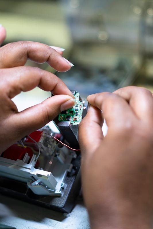 The moulds for injection moulding machines, for example, are already being supplied by companies from the local area and Chandra and his colleagues are currently setting up a local production network with other partners. Even some of the state-of-the-art stamping, spooling and injection-moulding machines, which currently run day and night, have been designed and built on site with support from Hager Group colleagues in France. The finished products are, in turn, tested exhaustively in a fully equipped test laboratory to ensure they are standards compliant. This laboratory makes it possible to observe how a 950° glowing wire is inserted into a Hager MCB to check its fire resistance. The plastic casing melts, but does not ignite. Test passed.