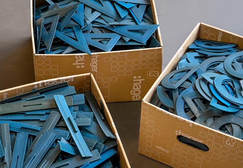 Medizinische Masken bekommen ein zweites Leben: Masken für Mund und Nase, die wir alle zum Schutz vor Covid-19 tragen, produzieren sehr viel zusätzlichen Müll. Bei der Hager Group machen wir etwas dagegen. Wir haben in Frankreich einen lokalen Partner gefunden, der Masken, die aus petrochemischen Produkten hergestellt werden, zu spritzgußfähigem Polymer verarbeitet. Aus dem Polymer können Geodreiecke und Lineale für Schulkinder produziert werden. Allein im Jahr 2021 haben wir 110.000 Masken gesammelt. Aus ihnen wurden 440 kg Polymer gewonnen und insgesamt 1.500 Schulkits hergestellt.