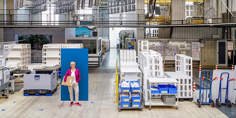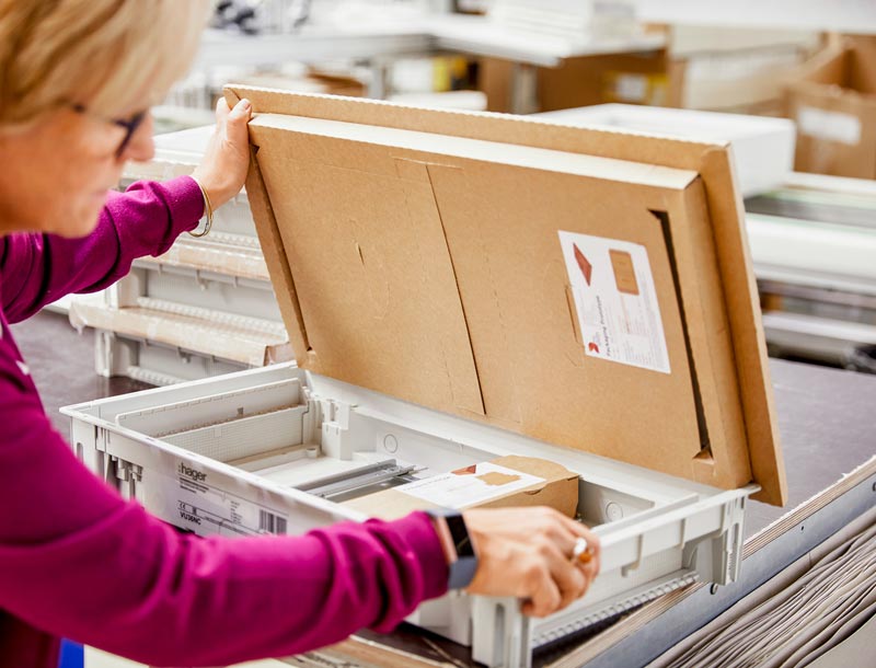 Die Hager Group verändert ihre Verpackungsprozesse und auch die Materialien, die in der Produktion verwendet werden. Heike Sprunck erklärt, dass auch die Teams aus der Produktion mit ins Boot geholt werden müssen. Jeder soll verstehen, warum die Veränderungen vorgenommen werden und was die Vorteile sind – für sie, die Kunden und die Umwelt. Und da unterschiedliche Materialien unterschiedliche Verpackungsmethoden erfordern, reichen die Stellschrauben von weniger Paketband über weniger und dünnere Folie bis hin zur Verwendung von Schrumpffolie.